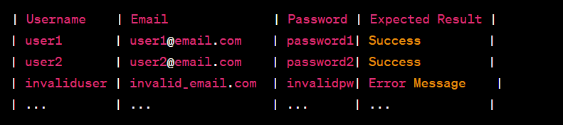 Excel Data Preparation: Prepare an Excel file containing user registration data, such as usernames, email addresses, passwords, and expected outcomes.