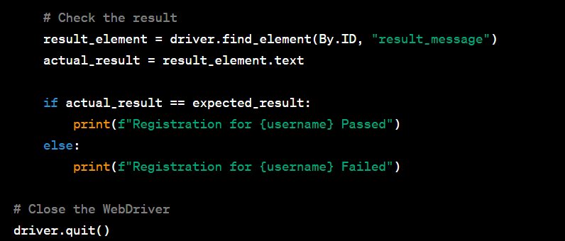 When you run this script, it will open the website, fill in the registration form with data from the Excel file, submit the form, and then compare the actual result with the expected result for each user.