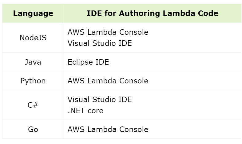 The following table shows a list of languages and the different tools and IDE that can be used to write the Lambda function −