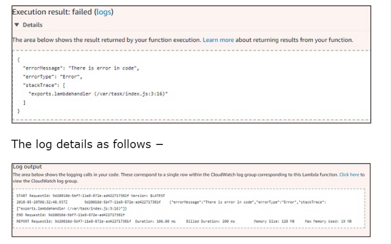 AWS Lambda function provides a callback function which is used to notify to the Lambda function that an error or success has happened. Note that here we have used nodejs as the runtime. The error handling will differ as per the language selected.