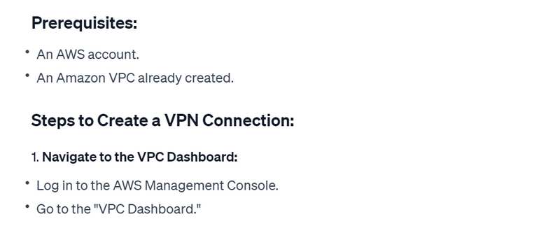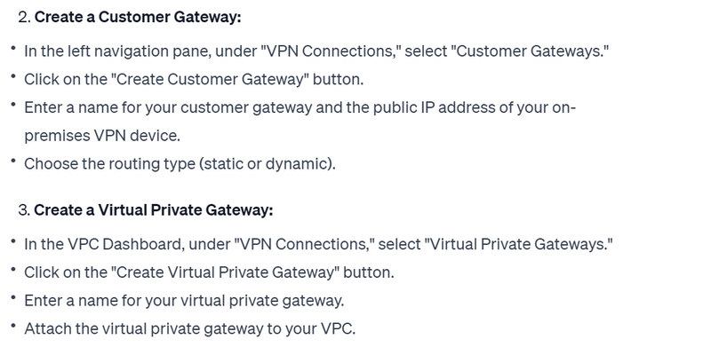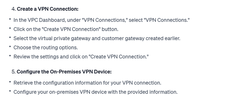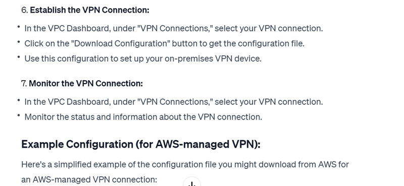 This is a simplified example, and the actual configuration may vary based on your specific requirements and the VPN device you are using on-premises. Always refer to AWS documentation and your VPN device documentation for accurate and up-to-date configuration details.
