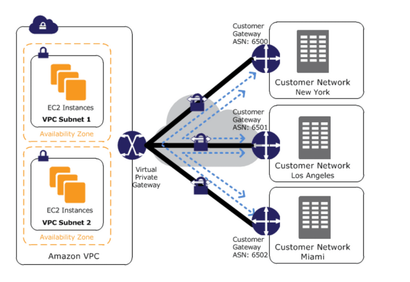 If you have multiple VPN connections, it can be used to provide secure communication between multiple on-premises sites. It uses a Virtual Private gateway in a detached mode that can be used without a VPC and operates on a simple hub-and-spoke model.