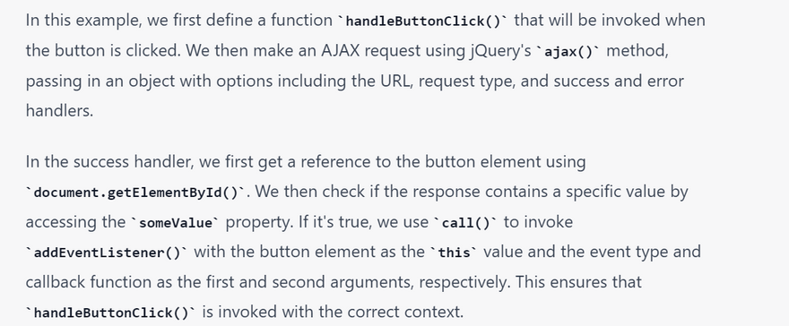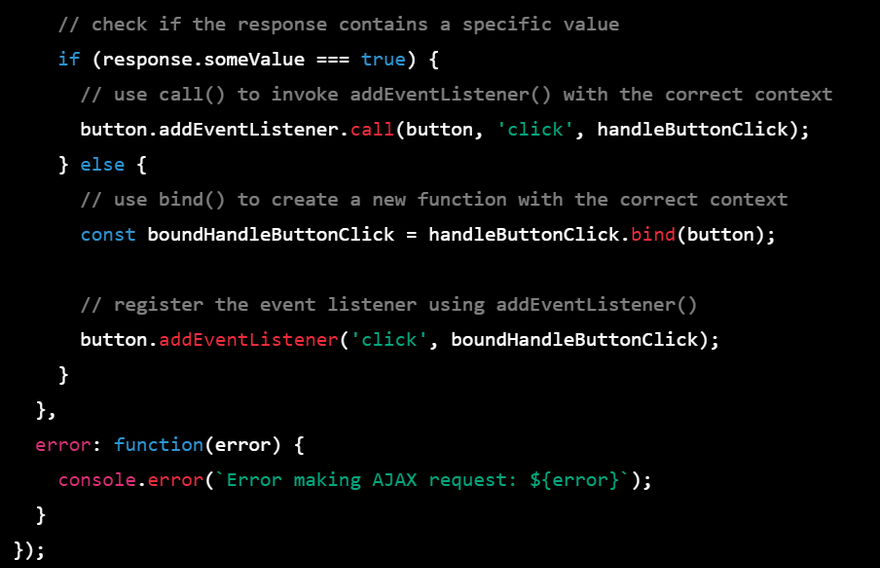 In the success handler, we first get a reference to the button element using document.getElementById(). We then check if the response contains a specific value by accessing the someValue property. If it's true, we use call() to invoke addEventListener() with the button element as the this value and the event type and callback function as the first and second arguments, respectively. This ensures that handleButtonClick() is invoked with the correct context.