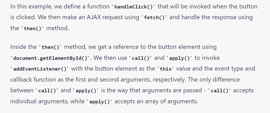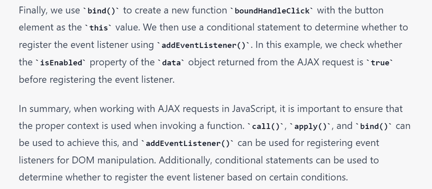 When working with AJAX requests in JavaScript, it may be necessary to add an event listener to an element only if a certain condition is met. call(), apply(), and bind() can be used to ensure that the proper context is used when invoking the event listener function, and a conditional statement can be used to determine whether to register the event listener. In this example, we'll show how to use call(), apply(), and bind() with addEventListener() and a conditional statement after a successful AJAX request.