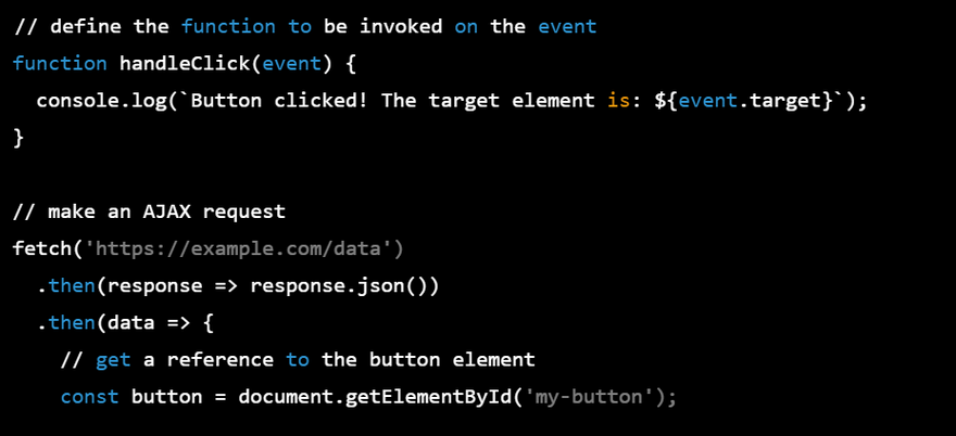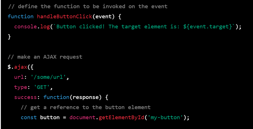 In this example, we first define a function handleButtonClick() that will be invoked when the button is clicked. We then make an AJAX request using jQuery's ajax() method, passing in an object with options including the URL, request type, and success and error handlers.