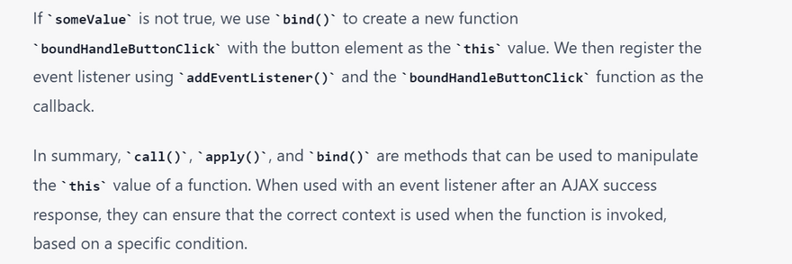 In summary, call(), apply(), and bind() are methods that can be used to manipulate the this value of a function. When used with an event listener after an AJAX success response, they can ensure that the correct context is used when the function is invoked, based on a specific condition.