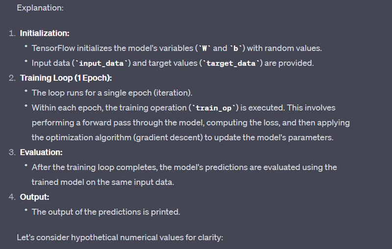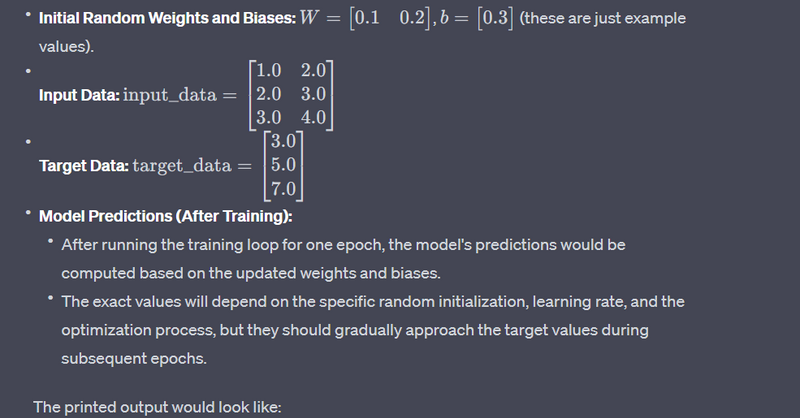 These are the model's predictions after one epoch of training. In a real-world scenario, you would typically run multiple epochs to allow the model to learn and improve its predictions over time.