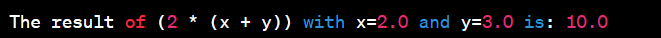print(f"The result of (2 * (x + y)) with x={x_value} and y={y_value} is: {result}")