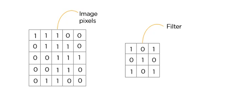 Consider the following 5x5 image whose pixel values are either 0 or 1. There’s also a filter matrix with a dimension of 3x3. Slide the filter matrix over the image and compute the dot product to get the convolved feature matrix.