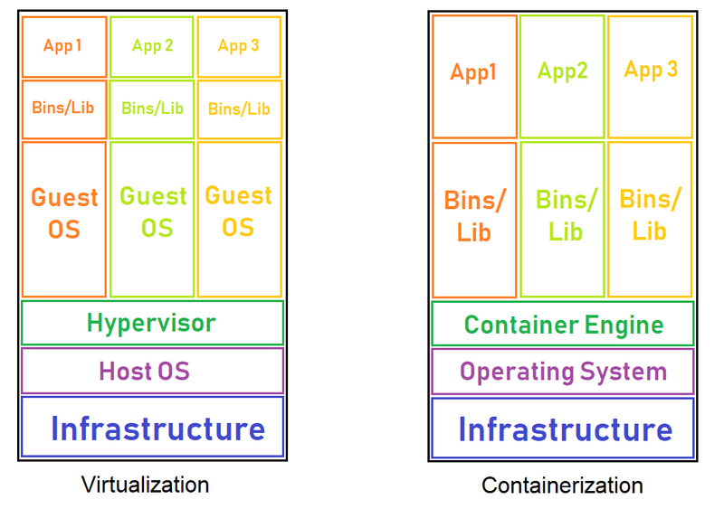 Virtualization technology and containerization technology are both forms of virtualization but operate at different levels and have distinct characteristics. Here's an explanation of the key differences between virtualization and containerization: