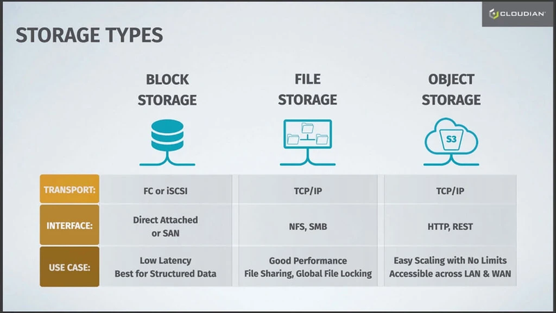 In cloud computing, different types of storage services are designed to cater to various storage needs and use cases. The three primary types of storage services are object storage, file storage, and block storage. Let's explore each of these: