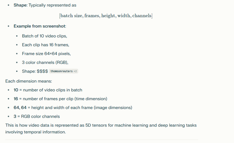 The 5-dimensional (5D) tensor refers to video data or data that changes over time, adding an extra time dimension to 4D tensors (such as batches of RGB images).