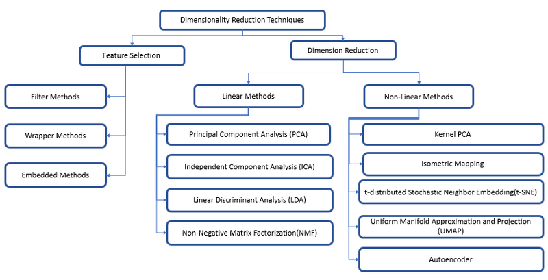 Dimensionality reduction methods like Principal Component Analysis (PCA) or t-Distributed Stochastic Neighbor Embedding (t-SNE) to reduce the number of dimensions.