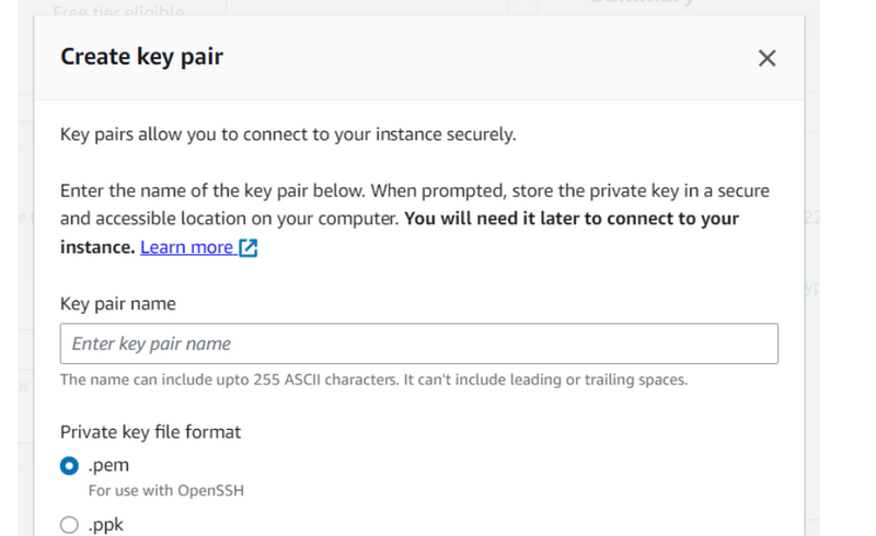 Step 4: Now, create a key-value pair, by clicking on “Create new key pair”. A window will pop up for creating key pair as shown below. The key value pair plays a major role while connecting to the EC2-Instance it will act as an SSH-Key to connect to the instance. Create Key-PairEnter name>>Select “.pem” and create. Automatically key pair which was created will be downloaded. Select the created key pair.