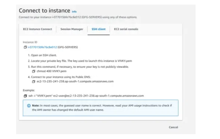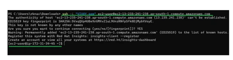 Step 3: Open the terminal and go to the folder where your .pem file is located and paste the key that you have copied in AWS and paste it in the terminal.