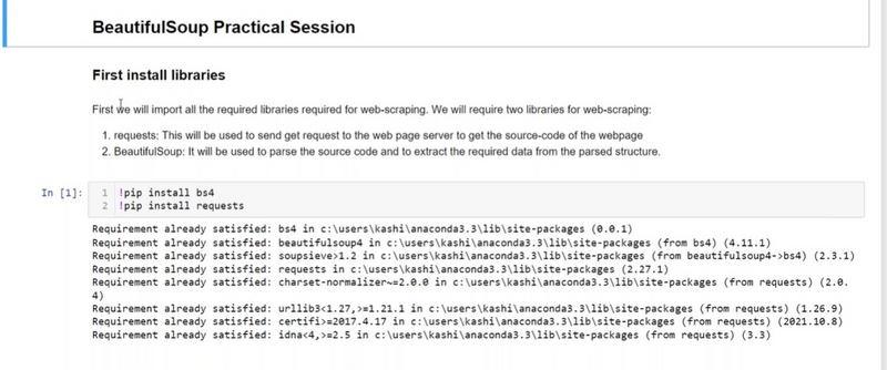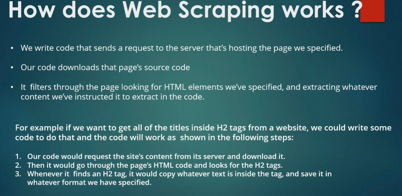 Web scraping is the process of extracting data from websites. It typically involves sending an HTTP request to a web page, downloading the HTML content of the page, and then parsing and extracting the desired information from the HTML. Below is a step-by-step example of how web scraping works in Python using the requests and BeautifulSoup libraries.