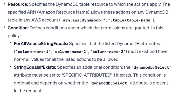 The dynamodb:Select requirement prevents the API action from returning any attributes that aren't allowed, such as from an index projection. To learn more about DynamoDB condition keys, see Specifying Conditions: Using Condition Keys in the Amazon DynamoDB Developer Guide. To learn about using multiple conditions or multiple condition keys within the Condition block of an IAM policy, see Multiple values in a condition.