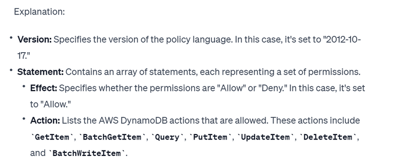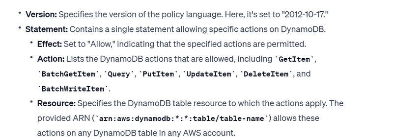 Resources: The wildcard () in the "Resource" field means that these actions are allowed on any DynamoDB resource.