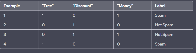 P(Spam | "Free" = 1, "Discount" = 1, "Money" = 0) ∝ P("Free" = 1 | Spam) * P("Discount" = 1 | Spam) * P("Money" = 0 | Spam)