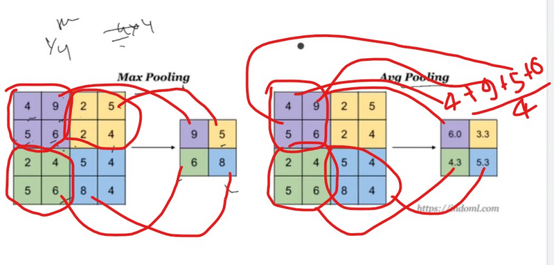 In both examples, the pooling window (also known as the pooling kernel or filter) slides over the input, and at each step, it performs the pooling operation within the window, producing a single value for that region in the output.
