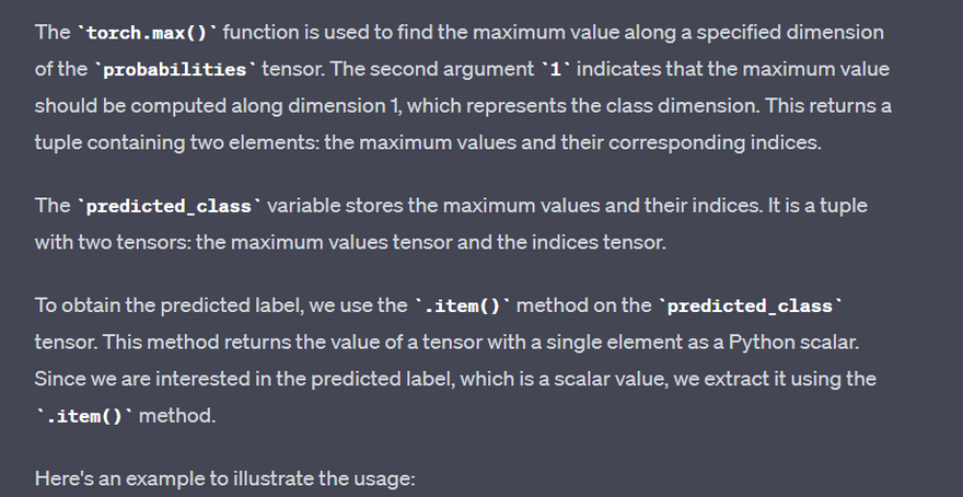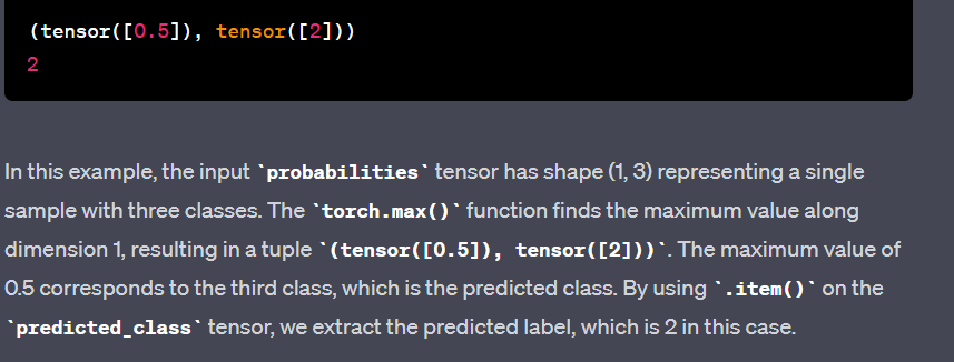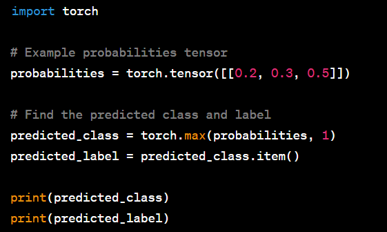 The torch.max function finds the index of the highest probability, and predicted_label stores the predicted class label as an integer.