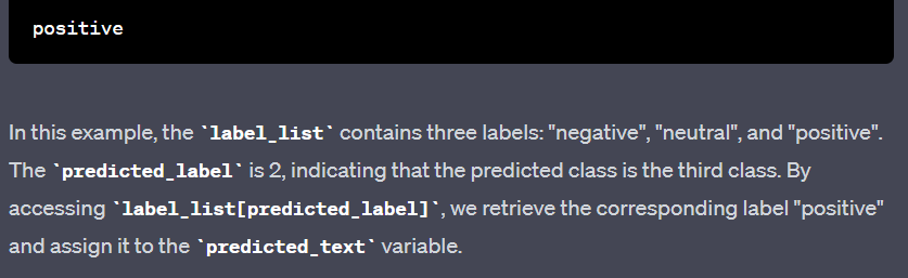 In this example, we assume a classification task with three classes: "negative," "neutral," and "positive." The predicted_label integer is used to index the corresponding label from the label_list, providing the human-readable predicted label.