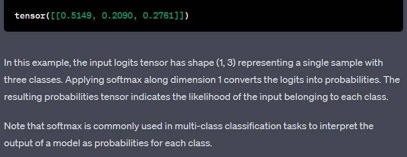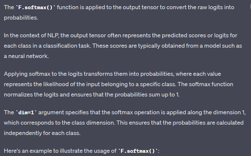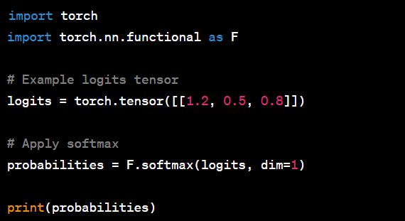 The softmax function normalizes the logits across the classes and converts them into probabilities. The dim=1 argument indicates that the softmax is applied along the second dimension, which represents the classes.