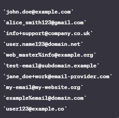 before @ any alphabetic ,numeric includes .%+-
