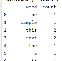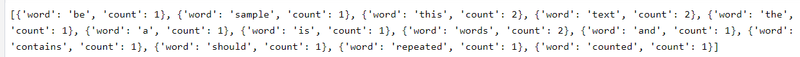 [{'word': 'the', 'count': 1}, {'word': 'should', 'count': 1}, {'word': 'sample', 'count': 1}, {'word': 'is', 'count': 1}, {'word': 'and', 'count': 1}, {'word': 'counted', 'count': 1}, {'word': 'repeated', 'count': 1}, {'word': 'text', 'count': 2}, {'word': 'words', 'count': 2}, {'word': 'be', 'count': 1}, {'word': 'contains', 'count': 1}, {'word': 'a', 'count': 1}, {'word': 'this', 'count': 2}]