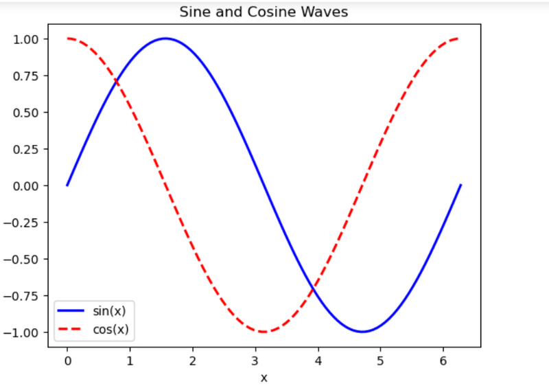 ax.set_xlabel('x')||ax.set_ylabel('y')||ax.set_title('Sine and Cosine Waves')||ax.legend()||plt.show()