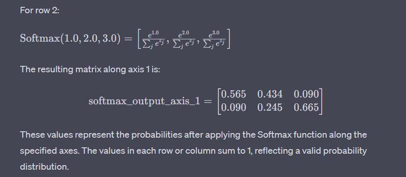 softmax_output_axis_1: Softmax is applied along axis 1, meaning that the Softmax operation is performed independently for each row. The resulting probabilities will sum to 1 along each row.