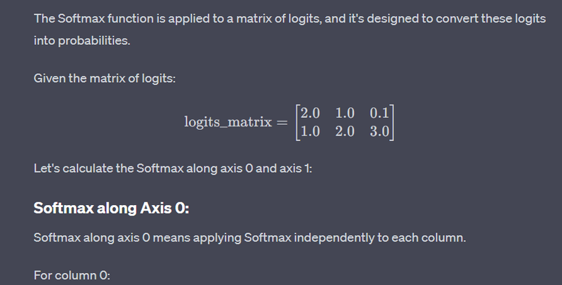 In this example, logits_matrix is a 2x3 matrix representing two sets of logits. The Softmax function is applied along different axes:
