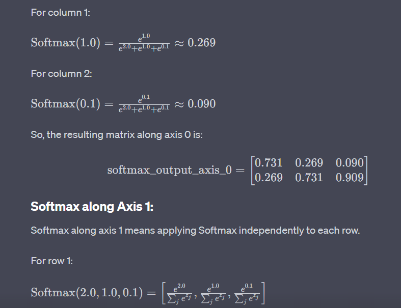 In softmax_output_axis_0, Softmax is applied independently to each column, and in softmax_output_axis_1, Softmax is applied independently to each row. The resulting matrices are probability distributions along the specified axes.