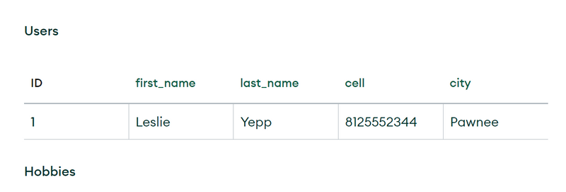 Let's consider an example of storing information about a user and their hobbies. We need to store a user's first name, last name, cell phone number, city, and hobbies.
