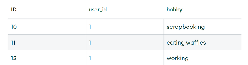 In a relational database, we'd likely create two tables: one for Users and one for Hobbies.