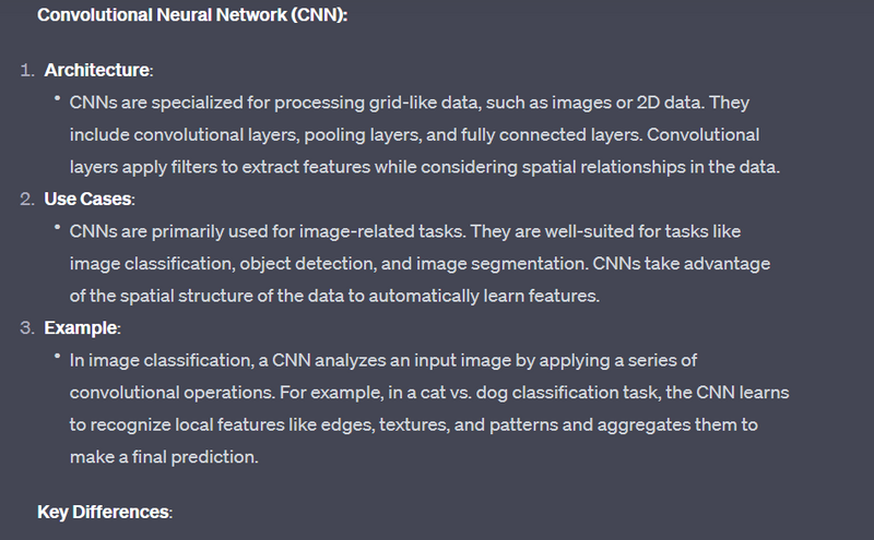 Suited for tasks involving sequences or time series data. RNNs have recurrent connections, allowing them to maintain a memory of previous inputs.