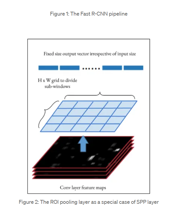 Fast R-CNN : In R-CNN we passed each region proposal one by one in the CNN architecture and selective search generated around 2000 region proposal for an image. So, it is computationally expensive to train and even test the image using R-CNN. To deal with this problem Fast R-CNN was proposed, It takes the whole image and region proposals as input in its CNN architecture in one forward propagation. It also combines different parts of architecture (such as ConvNet, RoI pooling, and classification layer) in one complete architecture. That also removes the requirement to store a feature map and saves disk space. It also uses the softmax layer instead of SVM in its classification of region proposal which proved to be faster and generate better accuracy than SVM.