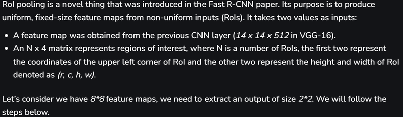 3.The ROI pooling layer is a special case of the spatial pyramid pooling (SPP) layer with just one pyramid level. The layer basically divides the features from the selected proposal windows (that come from the region proposal algorithm) into sub-windows of size h/H by w/W and performs a pooling operation in each of these sub-windows. This gives rise to fixed-size output features of size (H x W) irrespective of the input size. H and W are chosen such that the output is compatible with the network’s first fully-connected layer. The chosen values of H and W in the Fast R-CNN paper is 7. Like regular pooling, ROI pooling is carried out in every channel individually.