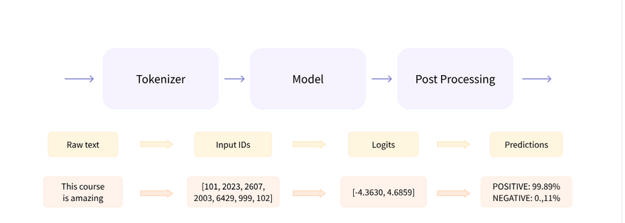 There are three main steps involved when you pass some text to a pipeline: