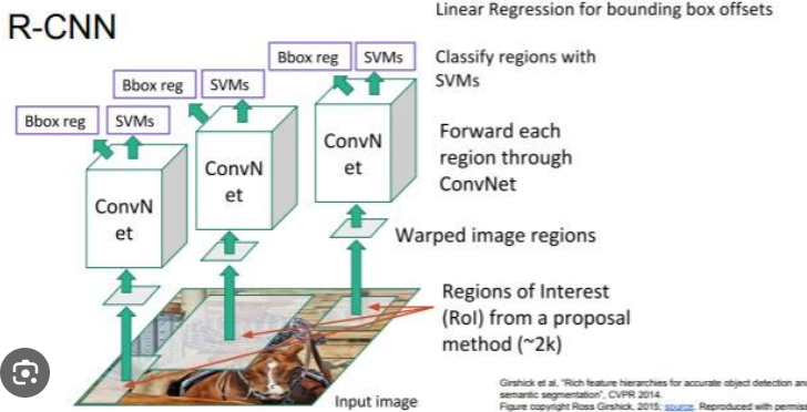 The R-CNN pipeline starts with the generation of region proposals. In the original R-CNN, external methods like Selective Search were used to propose candidate regions in the image that might contain objects.