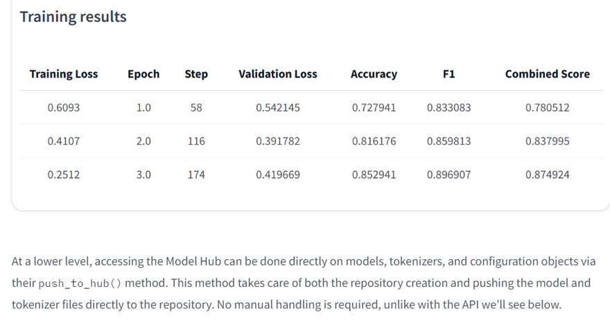 When you call trainer.train(), the Trainer will then upload your model to the Hub each time it is saved (here every epoch) in a repository in your namespace. That repository will be named like the output directory you picked (here bert-finetuned-mrpc) but you can choose a different name with hub_model_id = "a_different_name".