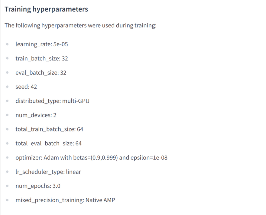 Once your training is finished, you should do a final trainer.push_to_hub() to upload the last version of your model. It will also generate a model card with all the relevant metadata, reporting the hyperparameters used and the evaluation results! Here is an example of the content you might find in a such a model card: