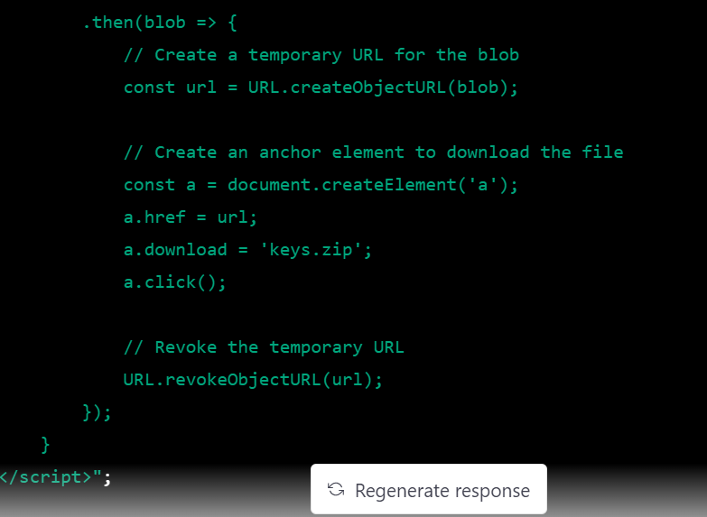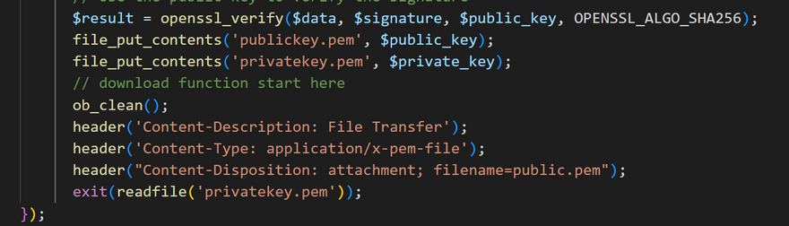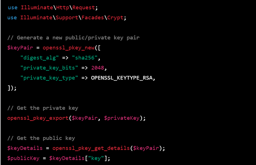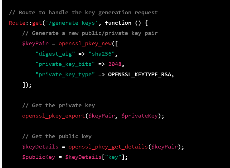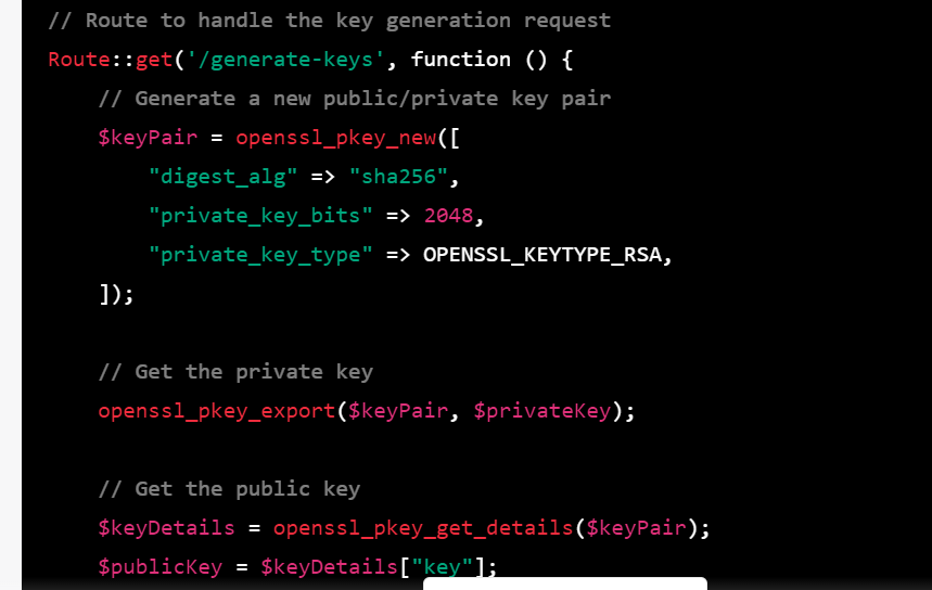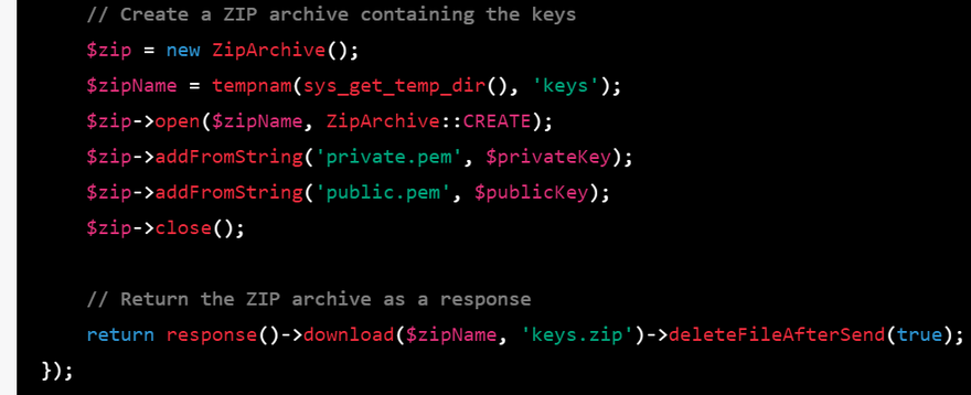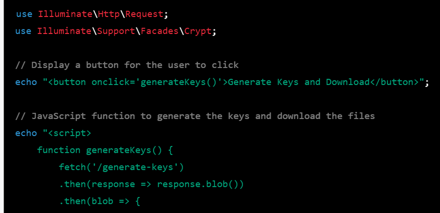 use Illuminate\Http\Request; use Illuminate\Support\Facades\Crypt; // Display a button for the user to click echo "<button onclick='generateKeys()'>Generate Keys and Download</button>"; // JavaScript function to generate the keys and download the files echo "<script> function generateKeys() { fetch('/generate-keys') .then(response => response.blob()) .then(blob => { // Create a temporary URL for the blob const url = URL.createObjectURL(blob); // Create an anchor element to download the file const a = document.createElement('a'); a.href = url; a.download = 'keys.zip'; a.click(); // Revoke the temporary URL URL.revokeObjectURL(url); }); } </script>"; // Route to handle the key generation request Route::get('/generate-keys', function () { // Generate a new public/private key pair $keyPair = openssl_pkey_new([ "digest_alg" => "sha256", "private_key_bits" => 2048, "private_key_type" => OPENSSL_KEYTYPE_RSA, ]); // Get the private key openssl_pkey_export($keyPair, $privateKey); // Get the public key $keyDetails = openssl_pkey_get_details($keyPair); $publicKey = $keyDetails["key"]; // Create a ZIP archive containing the keys $zip = new ZipArchive(); $zipName = tempnam(sys_get_temp_dir(), 'keys'); $zip->open($zipName, ZipArchive::CREATE); $zip->addFromString('private.pem', $privateKey); $zip->addFromString('public.pem', $publicKey); $zip->close(); // Return the ZIP archive as a response return response()->download($zipName, 'keys.zip')->deleteFileAfterSend(true); });