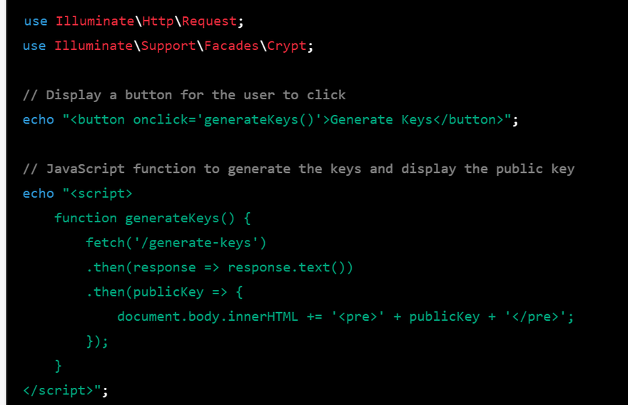 This code displays a "Generate Keys" button for the user to click. When the button is clicked, a JavaScript function sends a request to the server to generate the keys and retrieve the public key. The public key is then displayed on the page in a