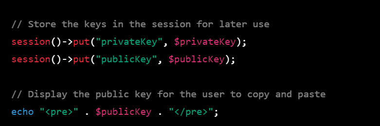 session()->put("privateKey", $privateKey);