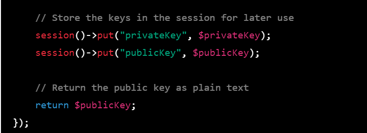 session()->put("publicKey", $publicKey);