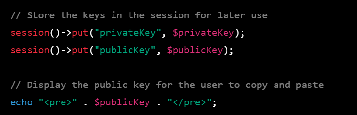 session()->put("privateKey", $privateKey);