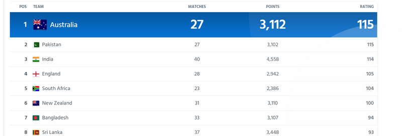 Top 10 ODI teams in men’s cricket along with the records for matches, points and rating