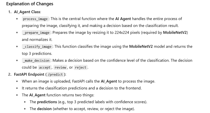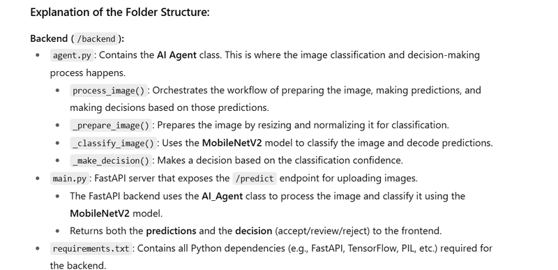 i am developing webisite in react backend python where i have to verify image content document how ai agent and deep leaning plays role wexplian with full coding example