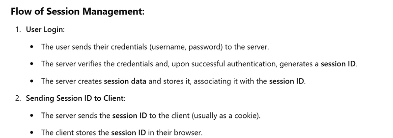 Subsequent Requests: For subsequent requests, the client automatically sends the session ID (in the cookie) to the server. The server then validates the session ID and checks if the user is authenticated.